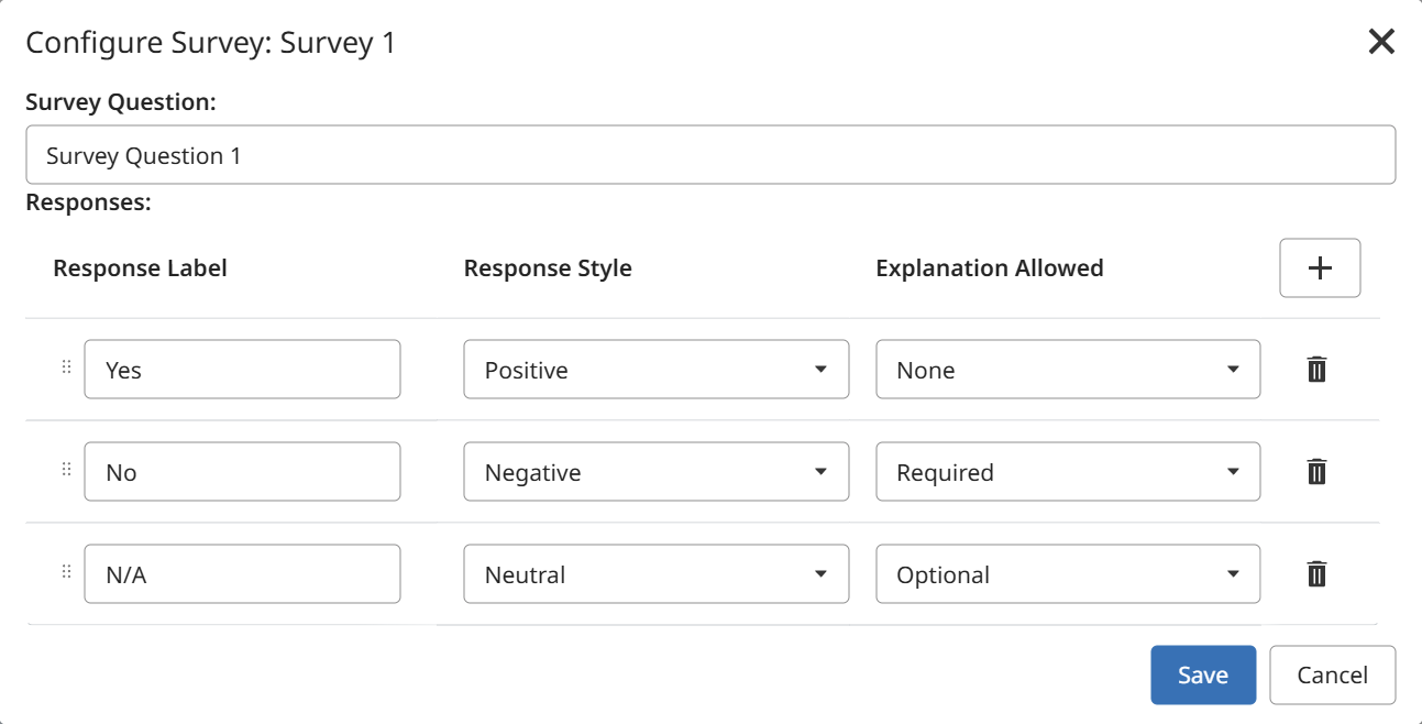 - Response Label: This is a set of customizable response to the survey question which will display under the survey question. Responses can be added by clicking the
