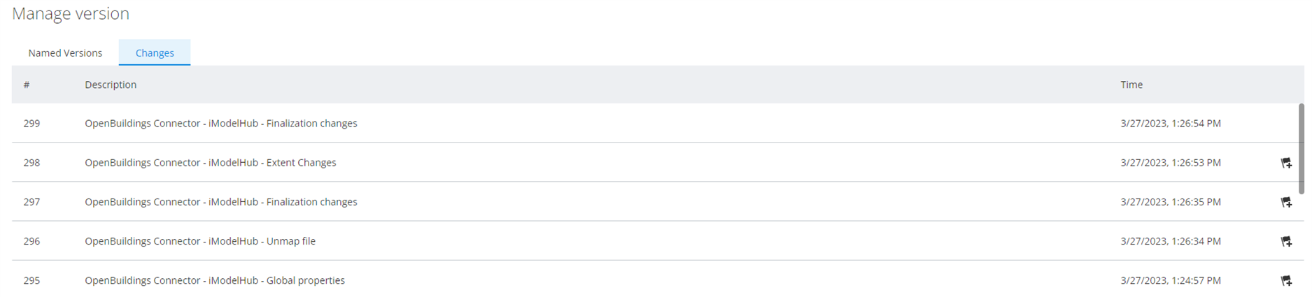 The Changes tab allows the user to select a specific changeset and create a Named Version by selecting the icon on the far right side of the interface.