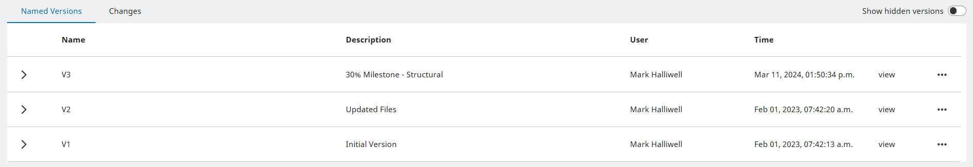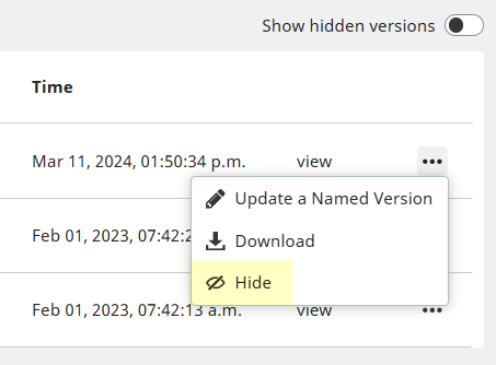 Once a Named Version is hidden is will be removed from the list. The toggle button at the top right can be used to show hidden Named Versions, where the context menu can be used again to Unhide.