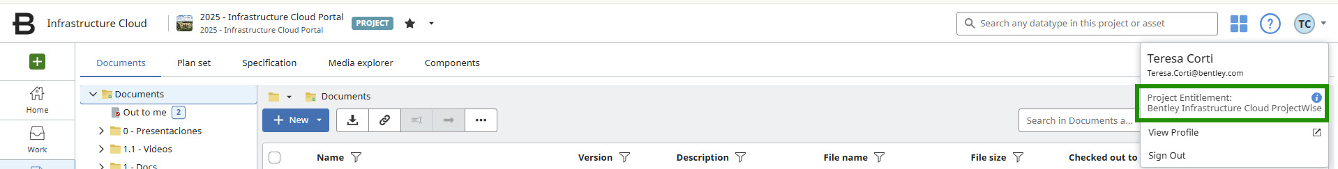 A. Undert your User Profile, at the top right corner of your screen, you will see your Project Entitlement: Bentley Infrastructure Cloud Connect or Bentley Infrastructure Cloud ProjectWise