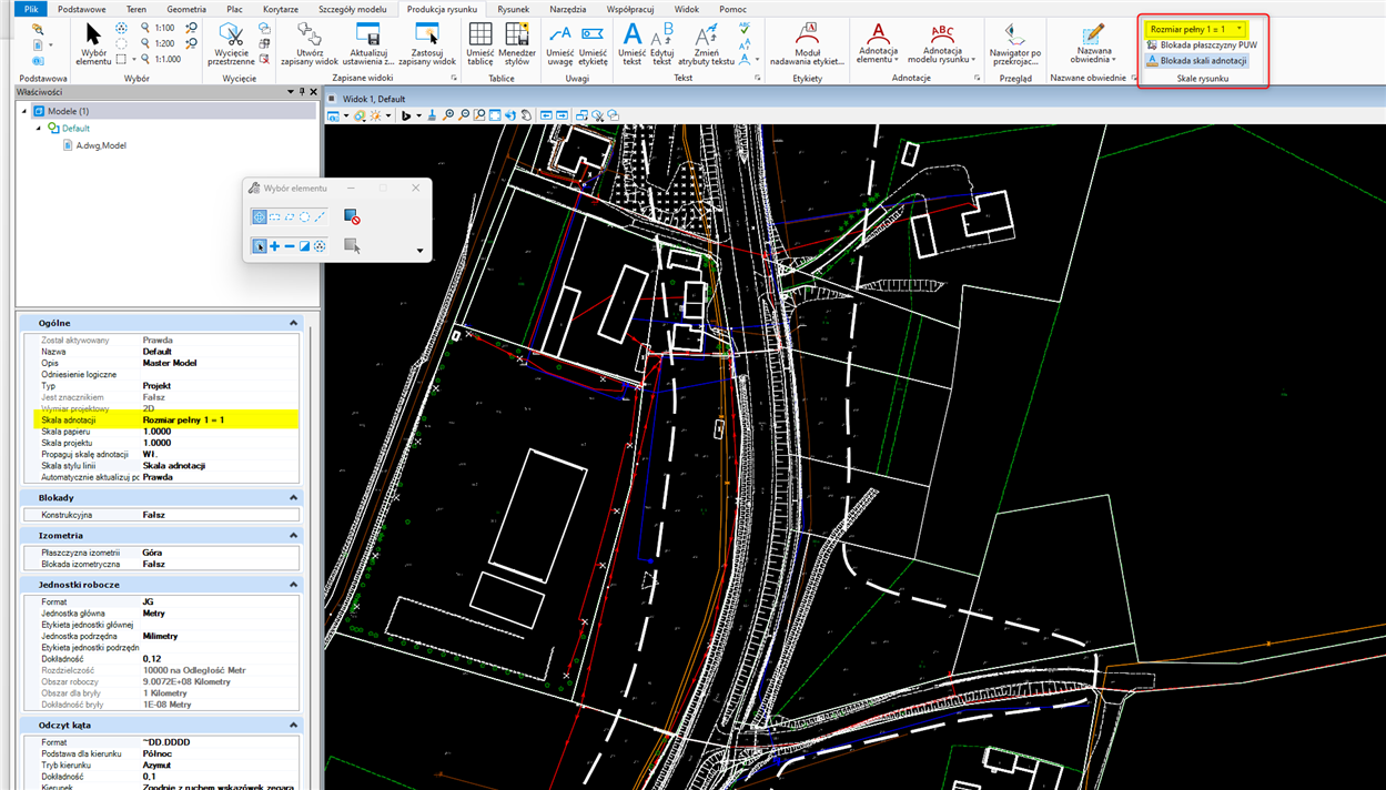 Możemy zmienić skalę rysunku. Produkcja rysunku > Skale rysunku > zmiana z 1:500 na 1:1: