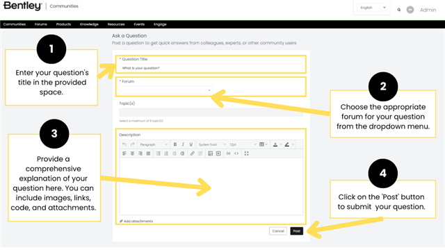 This button will take you to the "Ask a Question" form where you can post your questions and get answers from Bentley experts and Community users.