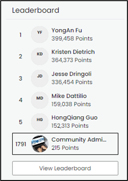 The Leaderboard displays the top contributors based on points accumulated. When logged in to Bentley Communities, your name will be highlighted on the leaderboard, showing your ranking.