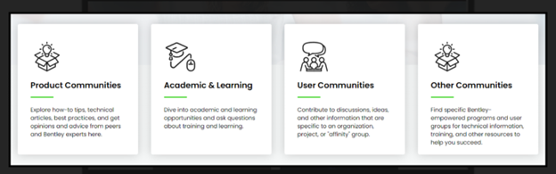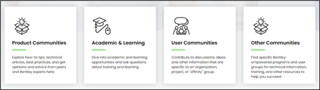 Explore our communities for tips, articles, and best practices. Get insights from experts and peers. Engage in discussions, share ideas, and connect with groups relevant to your work. Access Bentley's specialized programs and user groups for technical support, training, and resources to achieve success.