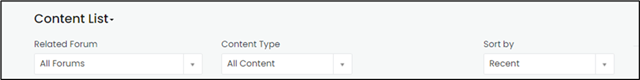 Toggle between the Content List and Activity Feed. You can filter according to the content type, forum, and the most recent or popular content.