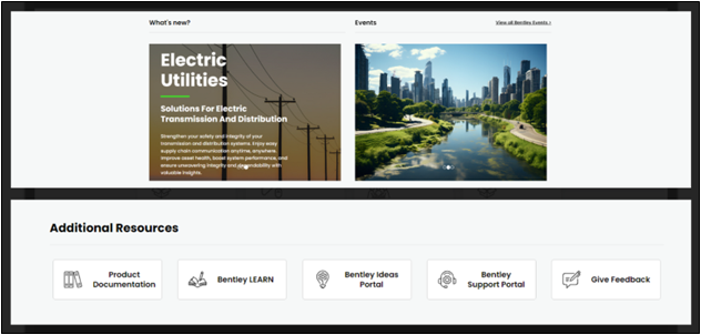 On the Bentley Communities homepage, you can discover a variety of resources such as the latest updates, Bentley Events, and convenient links to Product Documentation, Bentley LEARN, the Bentley Ideas Portal, the Bentley Support Portal, and a section to Provide Feedback.