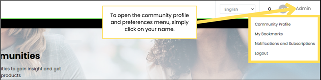Access your community profile by clicking on your login name in the top right corner of any community's page. Here you can edit your community profile, manage bookmarks, notifications, and subscriptions. Note, you must be logged in to access your profile.