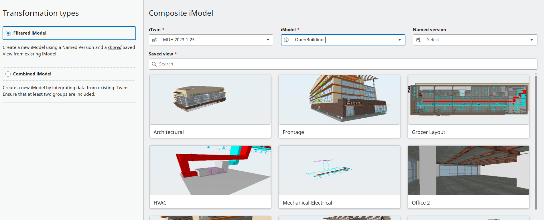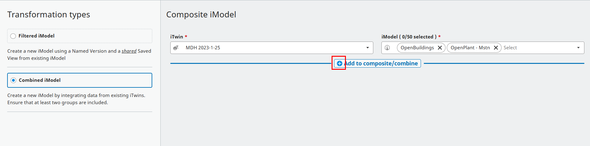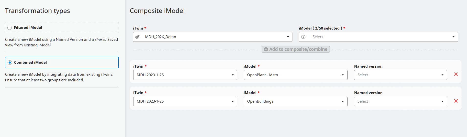 You can also Combine existing iModels into a new iModel. In similar fashion to Filter above, you will need to select an iTwin, then one or more iModels from that iTwin. For each iTwin you can select multiple iModels, and then clcik on the "+" button to add them to the configuration.