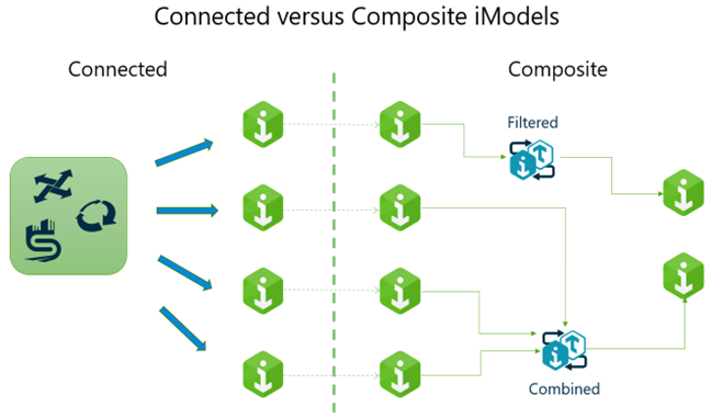 Composite iModels are composed of other iModels whereas Connected iModels are created from engineering CAD files.