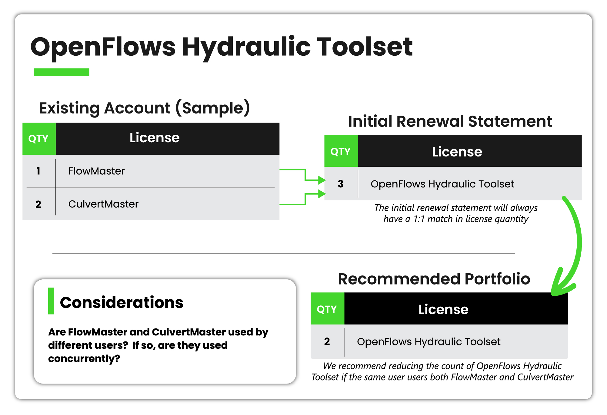 Os usuários existentes do FlowMaster e do CulvertMaster verão cada licença que possuem atualizada para uma licença do OpenFlows Hydraulic Toolset. Isso significa que os usuários que licenciam o FlowMaster e o CulvertMaster receberão uma licença do OpenFlows Hydraulic Toolset para cada licença atualmente ativa no SELECT ou por meio da assinatura Virtuoso.