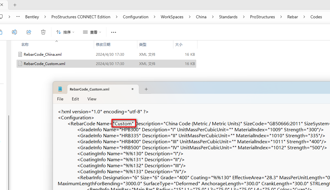 6.重新启动ProStructures CONNECT Edition,通过打开Rebar代码,可以看到有更改的新代码。