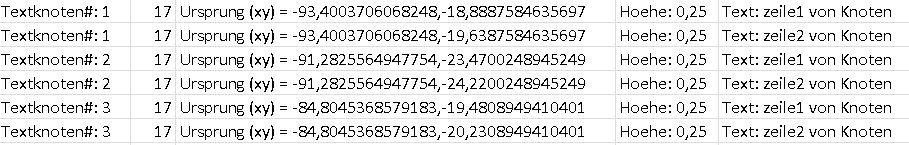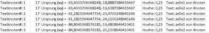 Ich habe über den Befehl Text platzieren einen zweizeiligen Text 3x plaztziert. In der Ausgabe ist zu sehen, dass die Textknoten dabei automatisch durchnummeriert werden. Sobald ein neuer Textknoten platziert wird, bekommt dieser die nächst höhere verfügbare Knotennummer