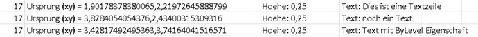 Bei Texten könnte für uns der Einfügepunkt, die Texthöhe und der Text selber interessant sein,