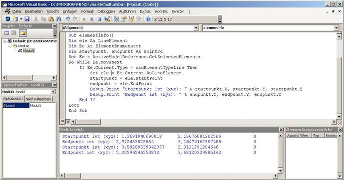 Es sind also nur einige wenige Zeilen notwendig, um die Endpunkte aller gewählten (Methode .GetSelectedElements) Linien (Typ msdElementTypeLine) aus dem aktiven Modell (ActiveModelReference) auszulesen.