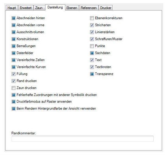 Im Druckstile Darstellung TAB kann der Benutzer die Anzeige Optionen für den Druck auswählen. Ein blaues Quadrat bedeutet, dass die Einstellung von der Zeichnungsdatei kommt. Ein Häkchen bedeutet, dass die Einstellung aktiviert ist. Ein leeres Kästchen bedeutet die Einstellung ist deaktiviert.