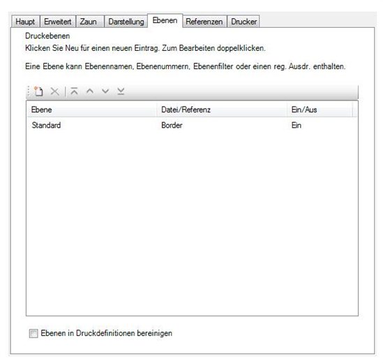 Sie können spezielle Ebenen der IPLOT Settingsdatei hinzufügen und angeben, ob diese Ebenen gedruckt (On) oder nicht gedruckt (Off) werden soll. Eine ähnliche Funktion gibt es im Druckstile unter dem Ebenen TAB