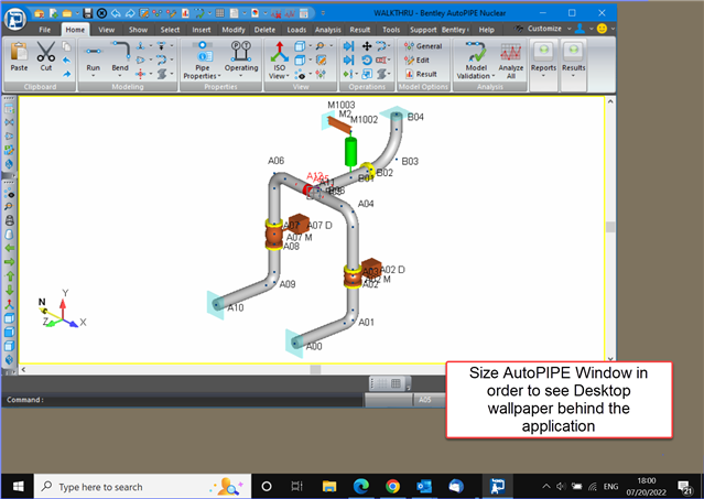 Emergency option, open an AutoPIPE model. Then press keyboard Win+D keys to view the desktop, again select the AutoPIPE icon from the tray so the application window appears on screen. If AutoPIPE application window is NOT set to maximum size, skip to next step. For those with application window set to maximum size, In the top right corner of the application window press the "Restore down" button, and size the window so one can see a portion of the desktop wallpaper.