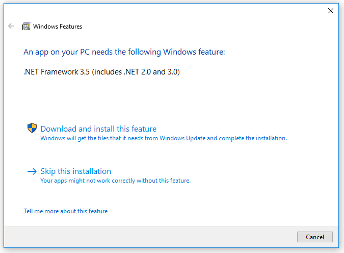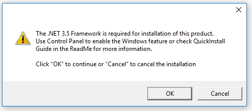 The Microsoft's .NET Framework 3.5 is required for installation. Since this version is generally not loaded in the Windows 10 environment you will need to do the following: