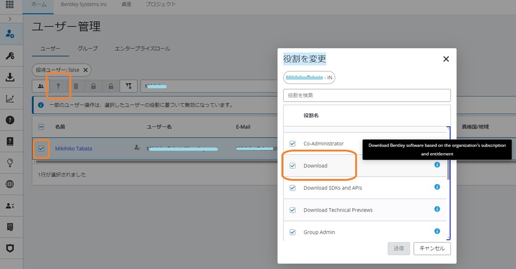 ユーザー管理サイトからの該当ユーザーを検索し、「役割を変更」を押し、「Download」ダウンロード権限を追加します。