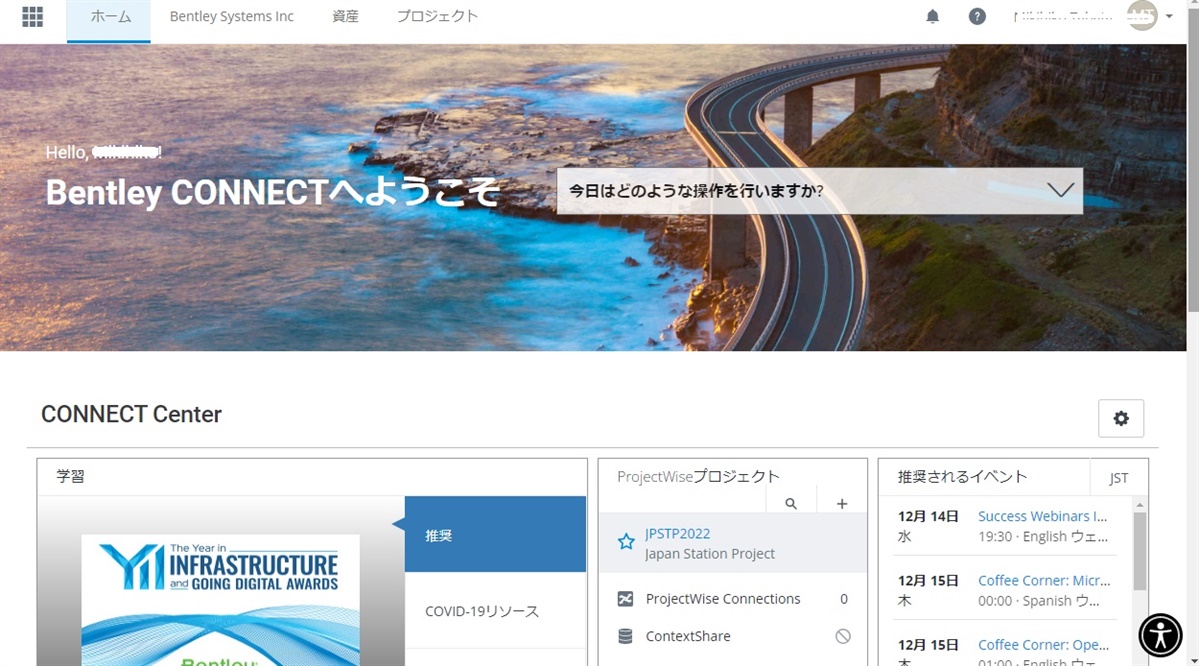 Bentleyユーザーアカウントを使って、CONNECTION Clientでサインインし、CONNECTION Clientのパネルにて、CONNECTION Centerをクリックします。