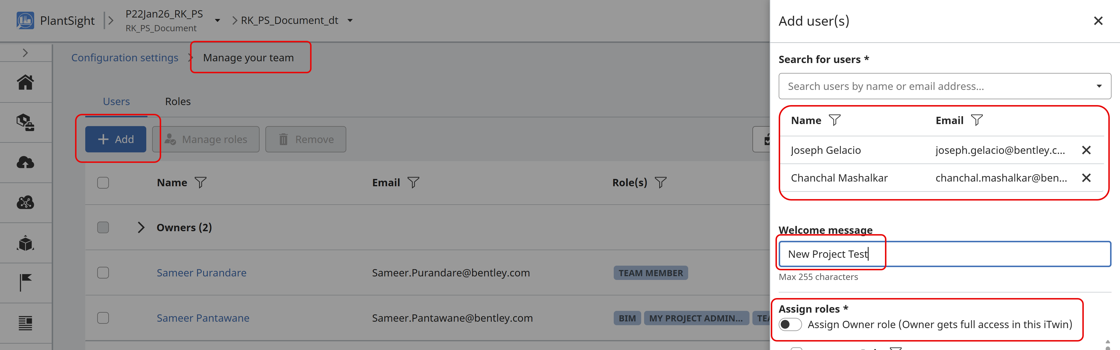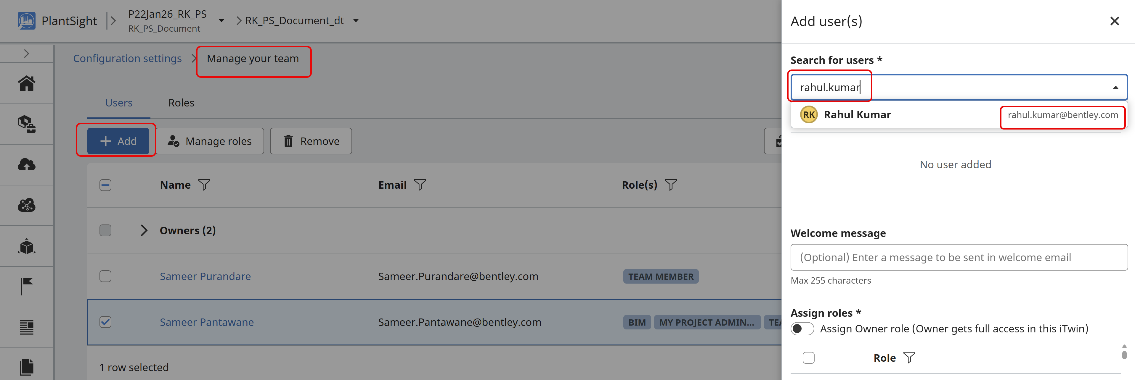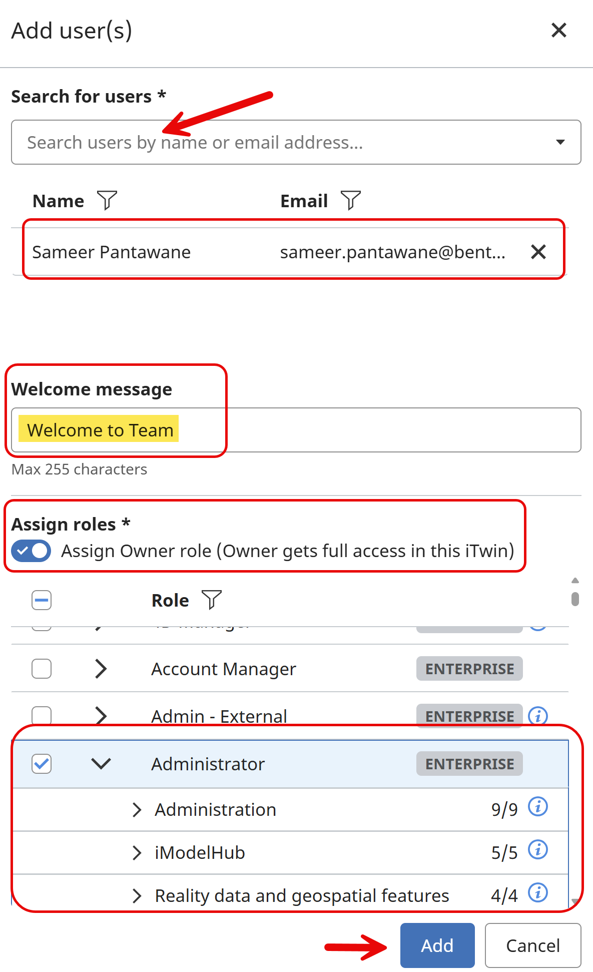 Add user- set 'welcome Message' - Opt for assigning user as Owner and add roles by selection options available