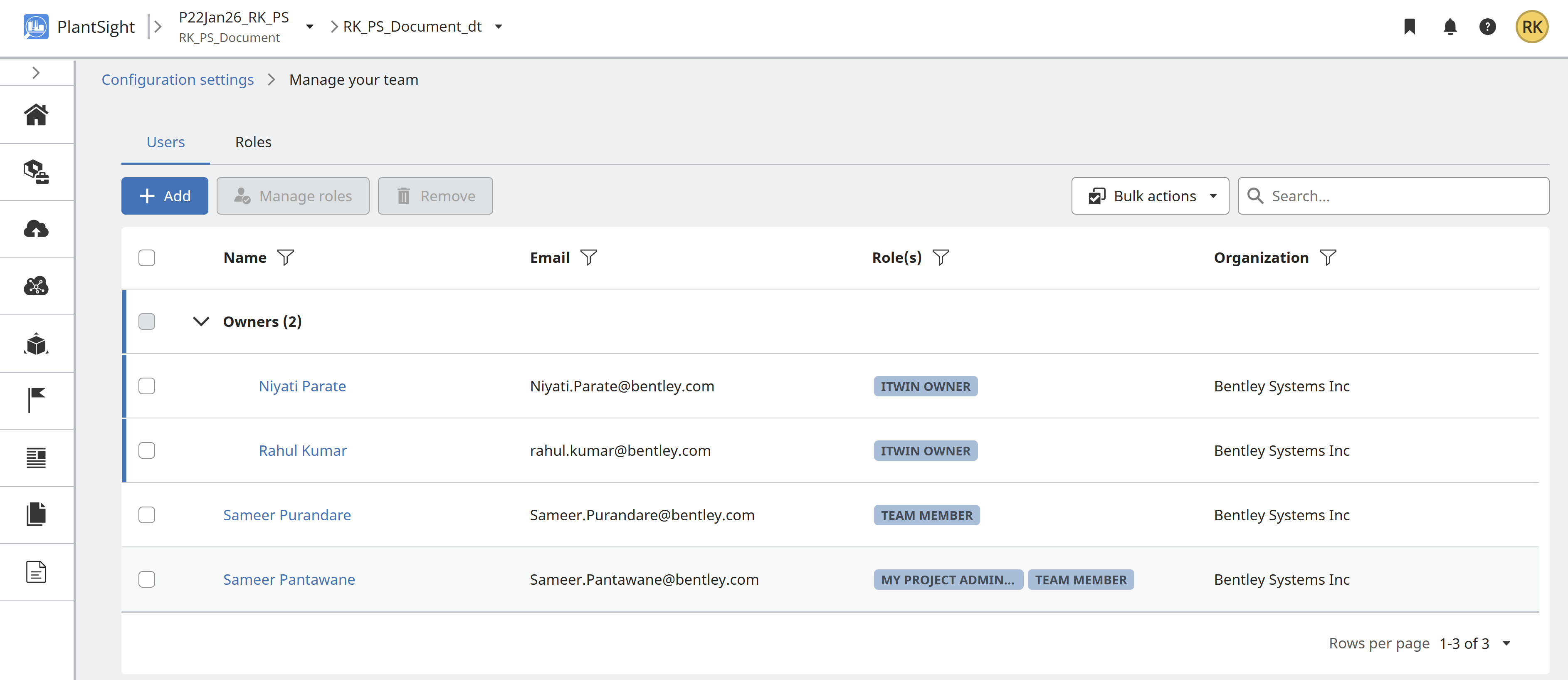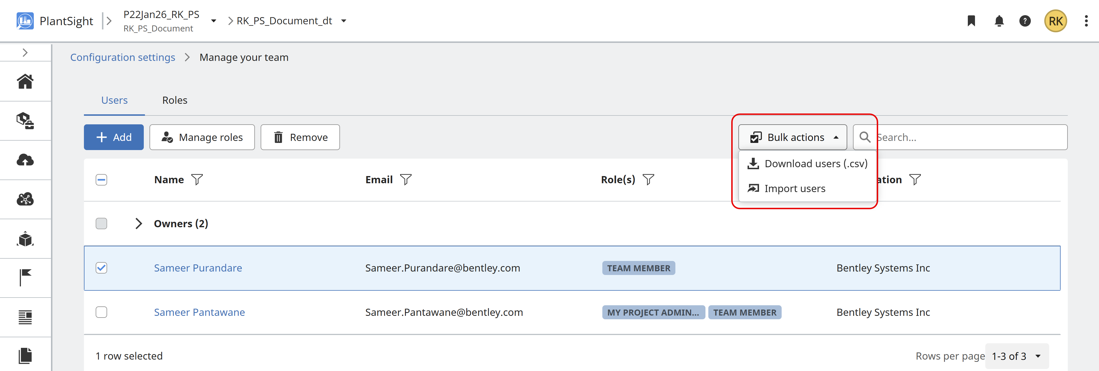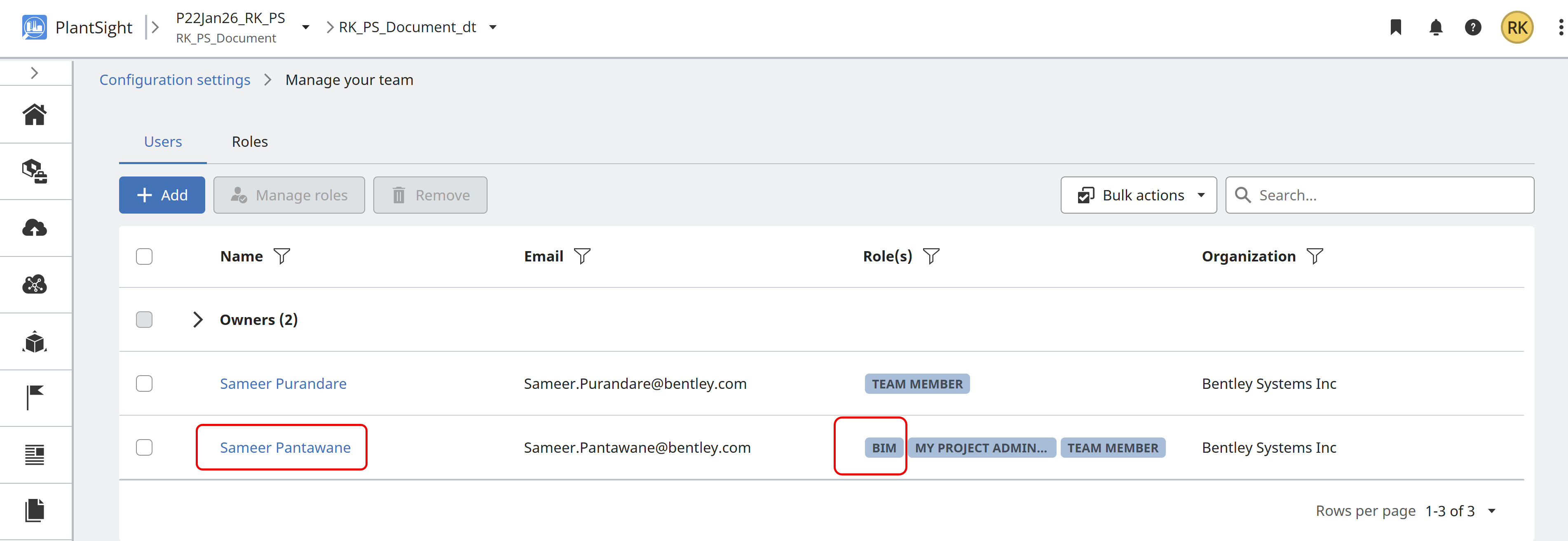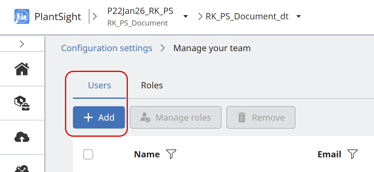 Users requiring access to the Administration settings in PlantSight, must have the role of CONNECT Services Admin set in the usermanagement.bentley.com for your organization. The person within your organization with permissions to manage Bentley Users, is required to perform the role change. The role assigned to the user is CONNECT Services Admin.