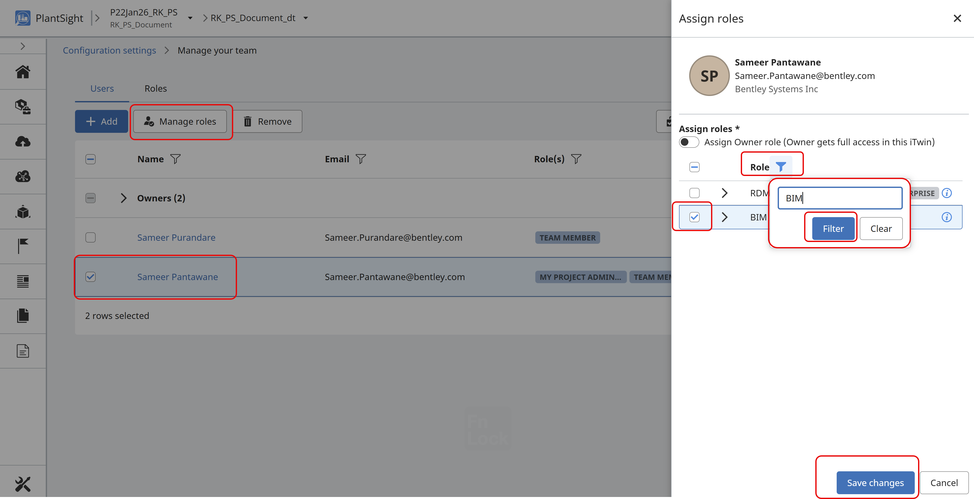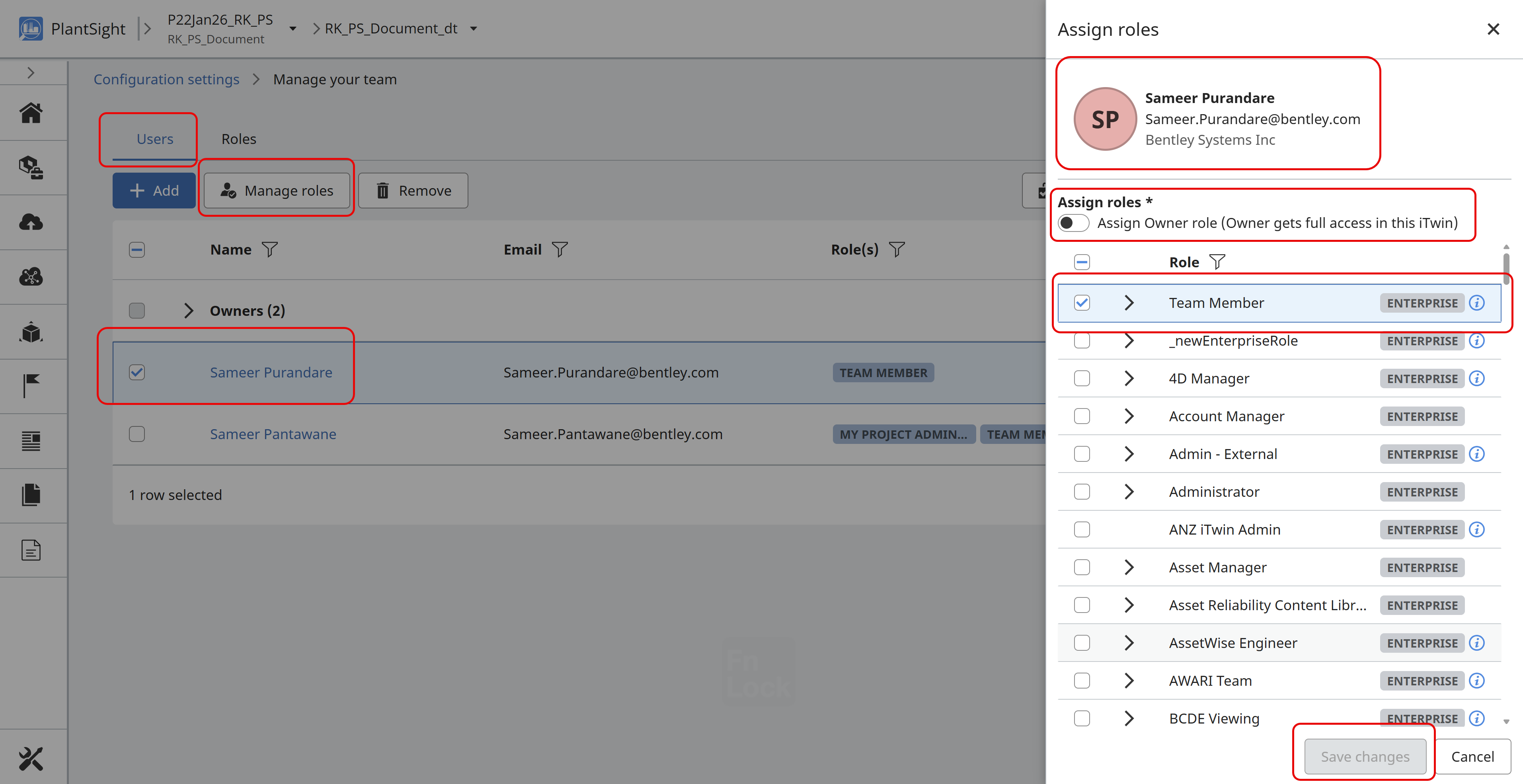 If you need to change a user's role in the project, you need to select the user and then modify the role.
