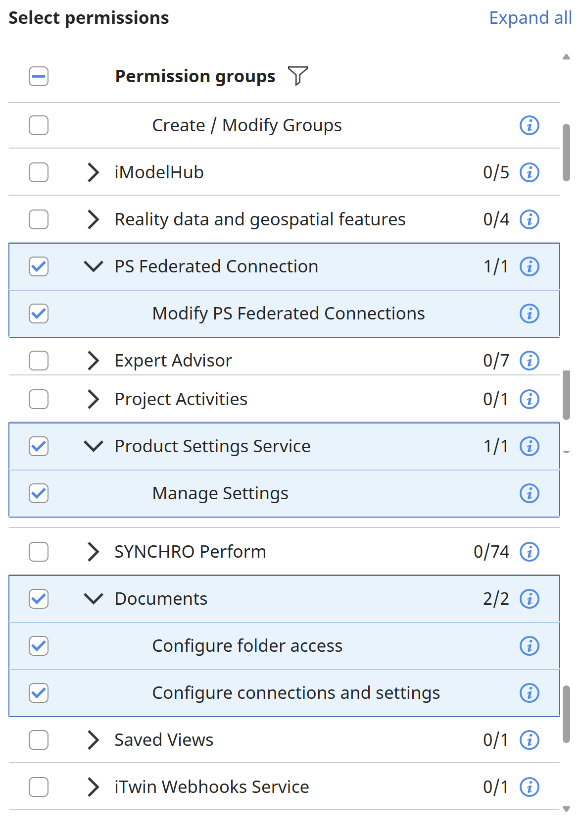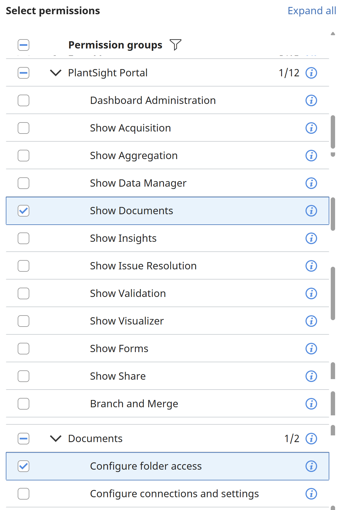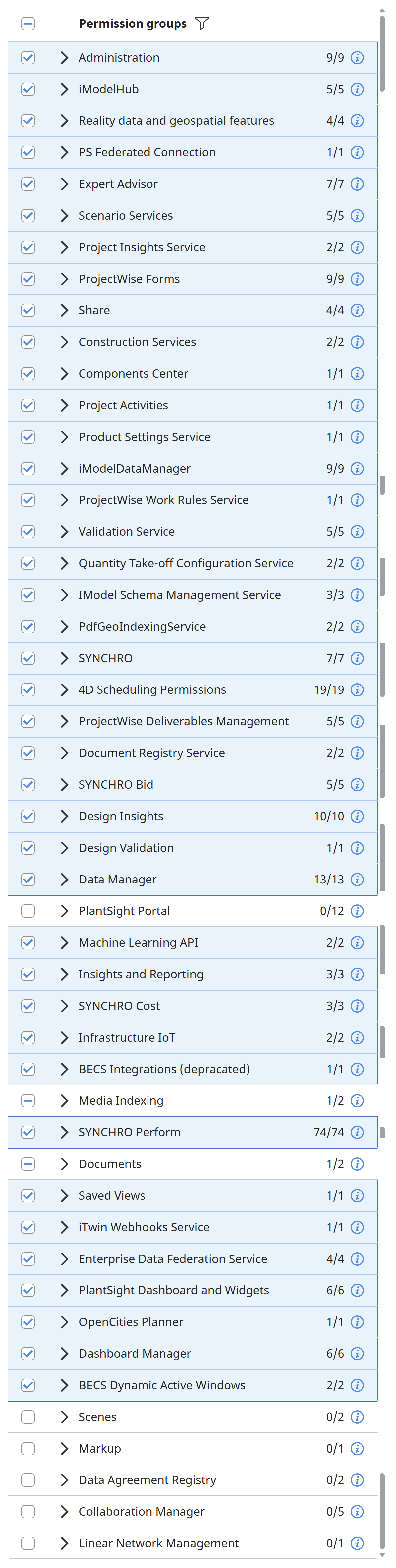 The underlying permissions for PlantSight have been configured at an upper level by Bentley. These permissions are referred to as RBAC (Role-Based Access Control) permissions. PlantSight uses a default RBAC page from Bentley CONNECT. This means that all RBAC permissions are present in the Services and Permissions content panel. In this document we will address the services and permissions specific to PlantSight.