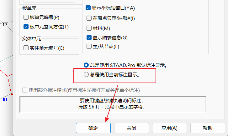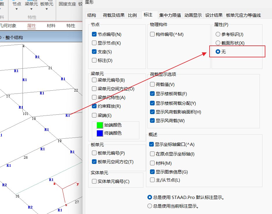 该现象引起的原因是因为模型处于“属性”页面中,在属性页面中STAAD.Pro的默认设置是显示“参考标识”。不能简单地通过常规方法关闭。