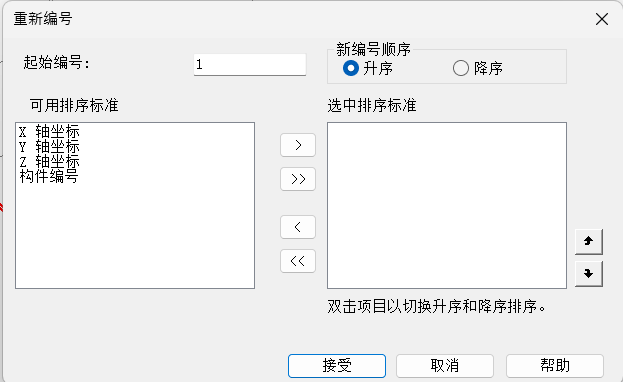 5. 设置重新编号参数,可以定义重新编号的具体规则,如选择合适的排序标准(使用箭头将它们移动到右侧)、 指定起始编号、调整排序顺序(上下箭头可调整排序标准)。