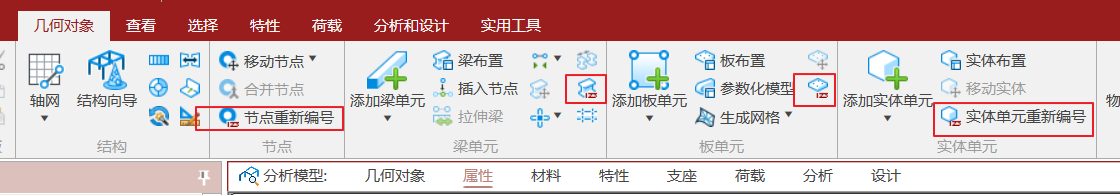 在STAAD.Pro软件中,对模型中的节点、梁、板或实体进行重新编号是一项常见的操作。每个实体(Entity)对应的重新编号工具都可以在几何元素菜单下找到: