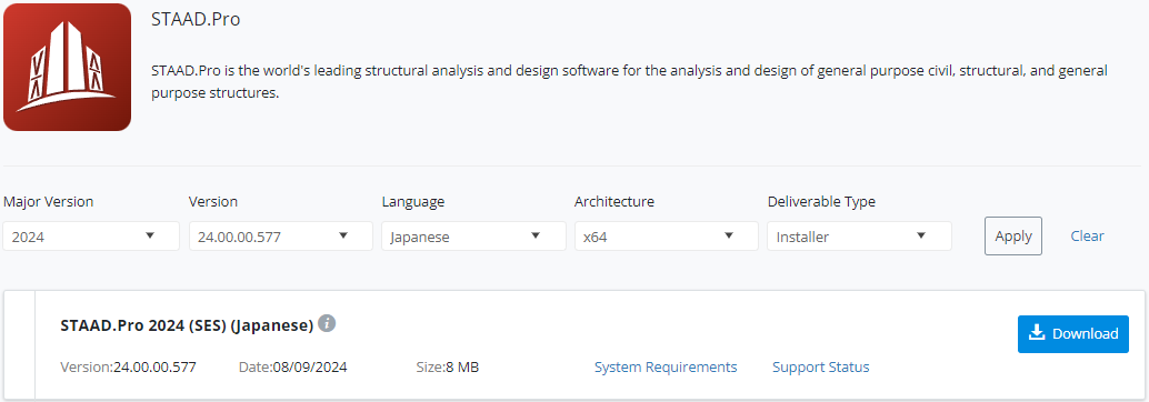 ソフトウェアダウンロードのURL(要ログイン):https://softwaredownloads.bentley.com/en/ProductDetails/1562