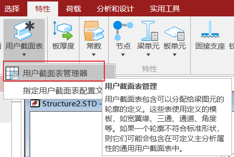 1. 打开特性>梁截面组>用户截面表>用户截面表管理器,点击新建用户截面表,选择要创建截面的截面类型。