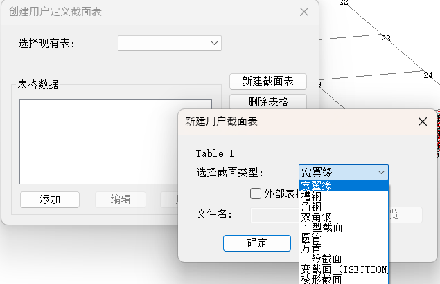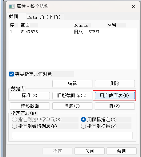 如果所需截面是标准形状,如宽翼缘、槽钢、角钢、双角钢、T型截面、方圆管等,您可以使用用户截面表选项来定义它。