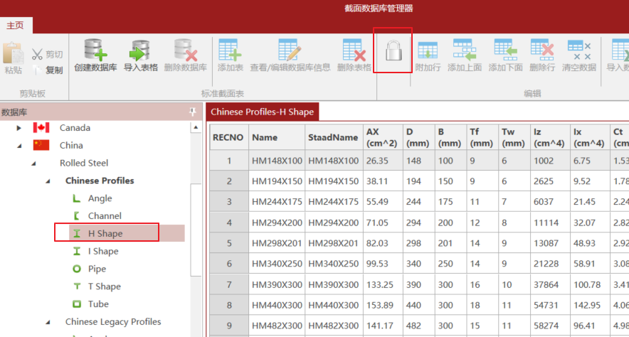 2. 双击要添加截面的数据库表(例如图中的H形)并点击锁定图标解锁表格。
