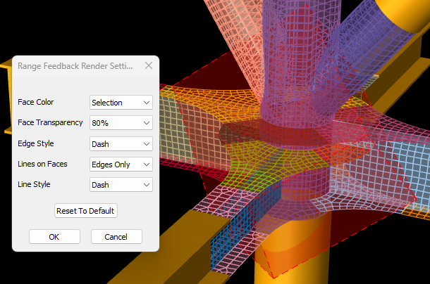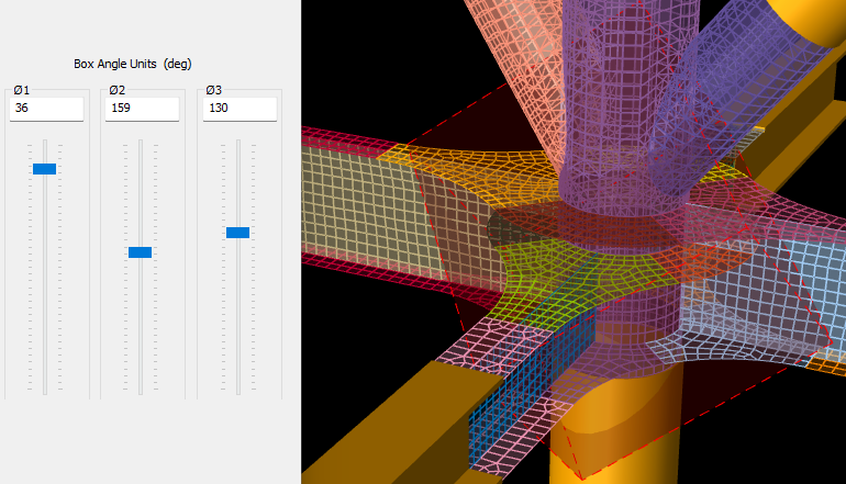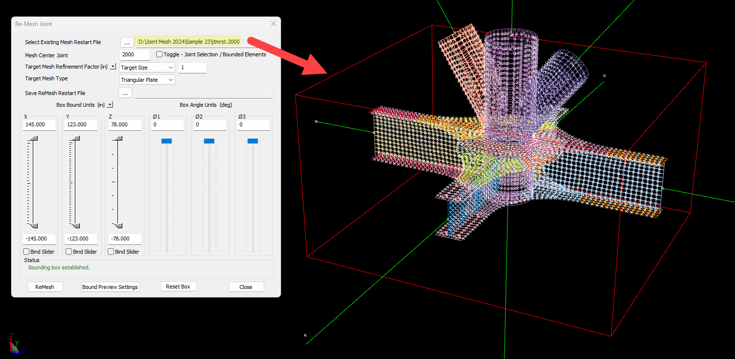 1. Use Select Existing Mesh Restart File to load the JointMesh restart file which was created when the joint was meshed. The restart file contains a map of the finite element mesh and the original geometry of the meshed beam elements. Once the restart file is loaded, it selects the joint which was originally meshed and automatically sets the size of the bounding box to its extents. A box will appear as below: