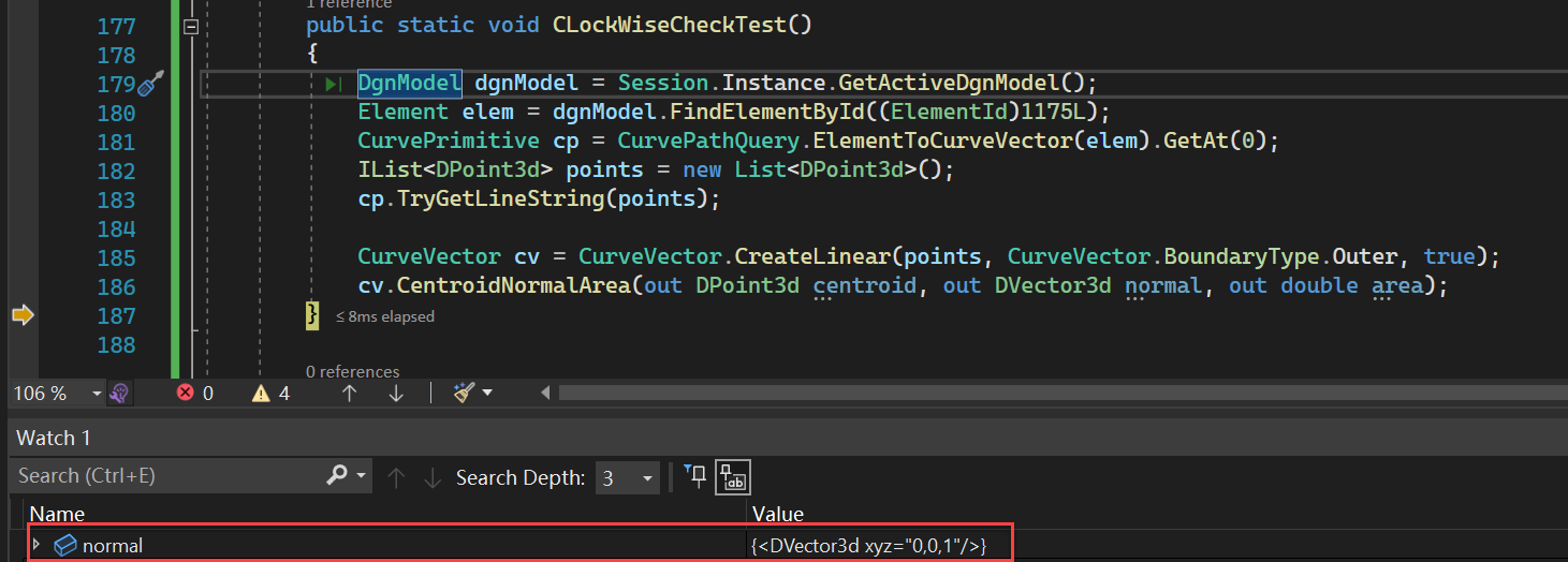 如果想判断一个线串是顺时针还是逆时针绘制的,我们可以利用线串上的点来构造一个封闭的CurveVector,然后可以调用CurveVector下的CentroidNormalArea方法来得到该封闭区域的发现方法,从而可以判断出该线串的方向: