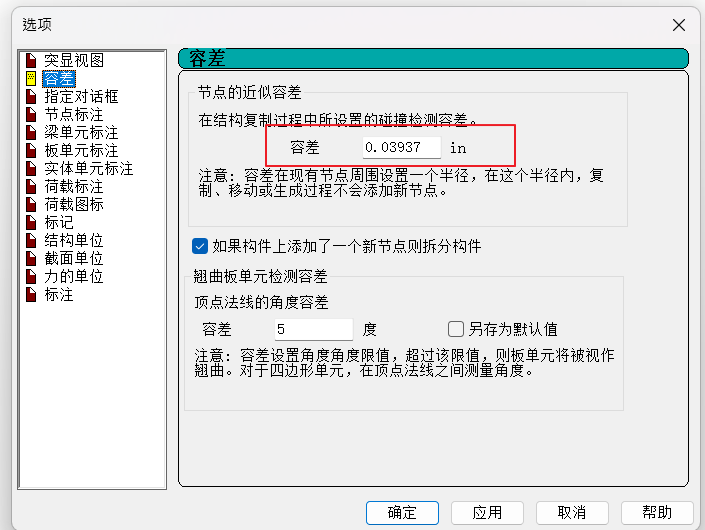 按照下面的图示设置一下容差,确保容差值没有设置为0或一个非常大的数值。对于米制单位,可以使用0.001米,对于英制单位,可以使用0.1英寸作为容差。