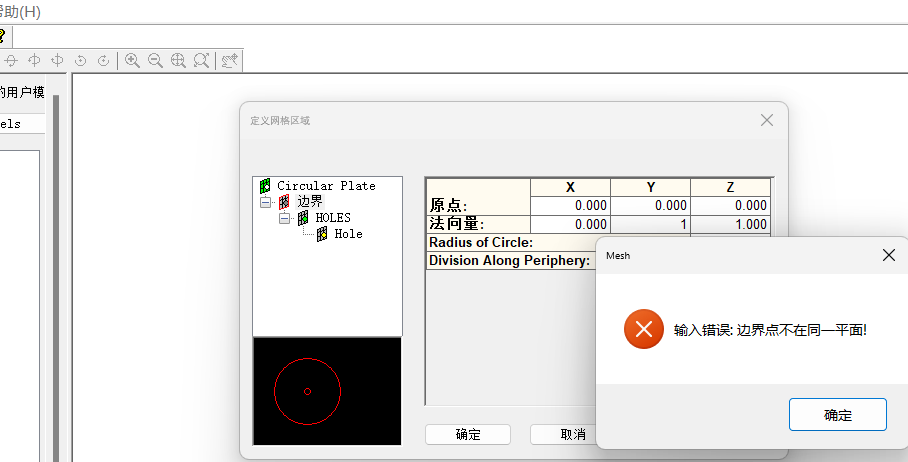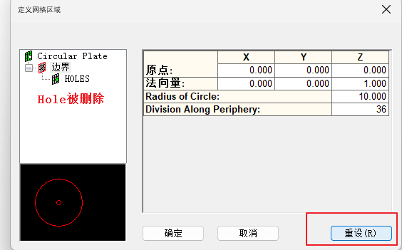 在输入之前,首先点击重设按钮(这时,洞会被删除),这时再设置法向量的值,点击确定就不再报错。