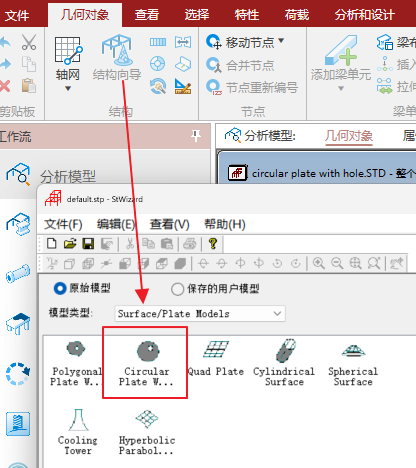 STAAD的结构向导提供了一些预定义的形状,用户可以直接使用这些形状来创建结构模型。如果您需要创建一个圆形的构件(meshed plate),按照图中位置选择“Circular Plates”,再输入相关参数即可。