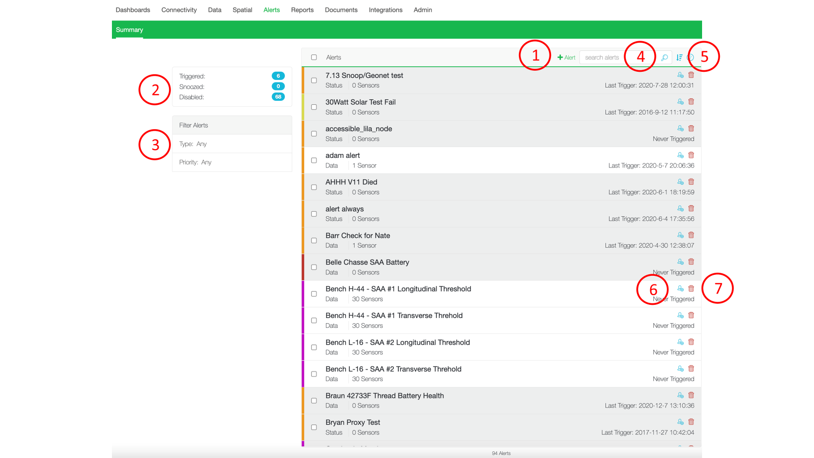 1 - By hitting "+ Alert" you can add either a Data or Status alert. Data Alerts notify the User when a data value surpasses a set threshold and Status Alerts notify the User when Connections, Devices, or Sensors have not responded in a set amount of time. Click the links to learn more about what each does and how to set each one up.