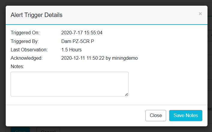 1 - Clicking on the eye icon will open the Alert Trigger Details, providing information regarding when it was triggered, devices involved and who acknowledged it. It's also possible to add notes to each record.