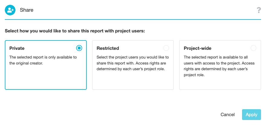 6. Reports can be shared by selecting this will give you the option to select private, sharing to only yourself, or to select custom which will allow you to choose the users that you would like to receive the report.