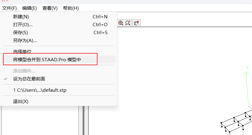 4. 到文件菜单中选择“将模型合并到STAAD模型中”。放大/缩小后的模型将出现在程序的主绘图窗口中。