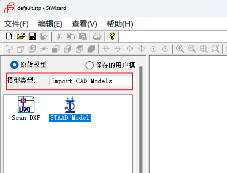 1. 打开结构向导,点击“模型类型”下拉列表,选择“导入CAD模型”,双击“STAAD模型”图标;