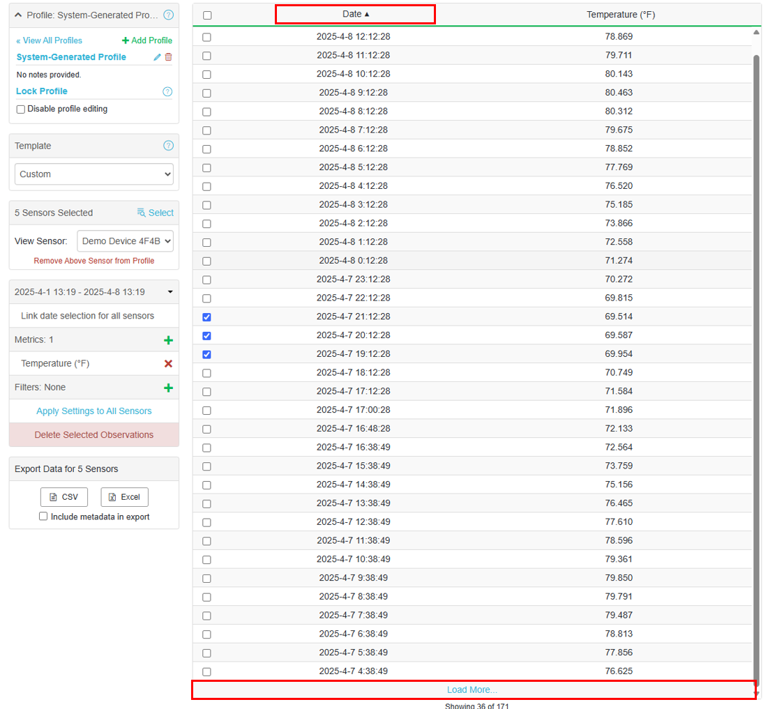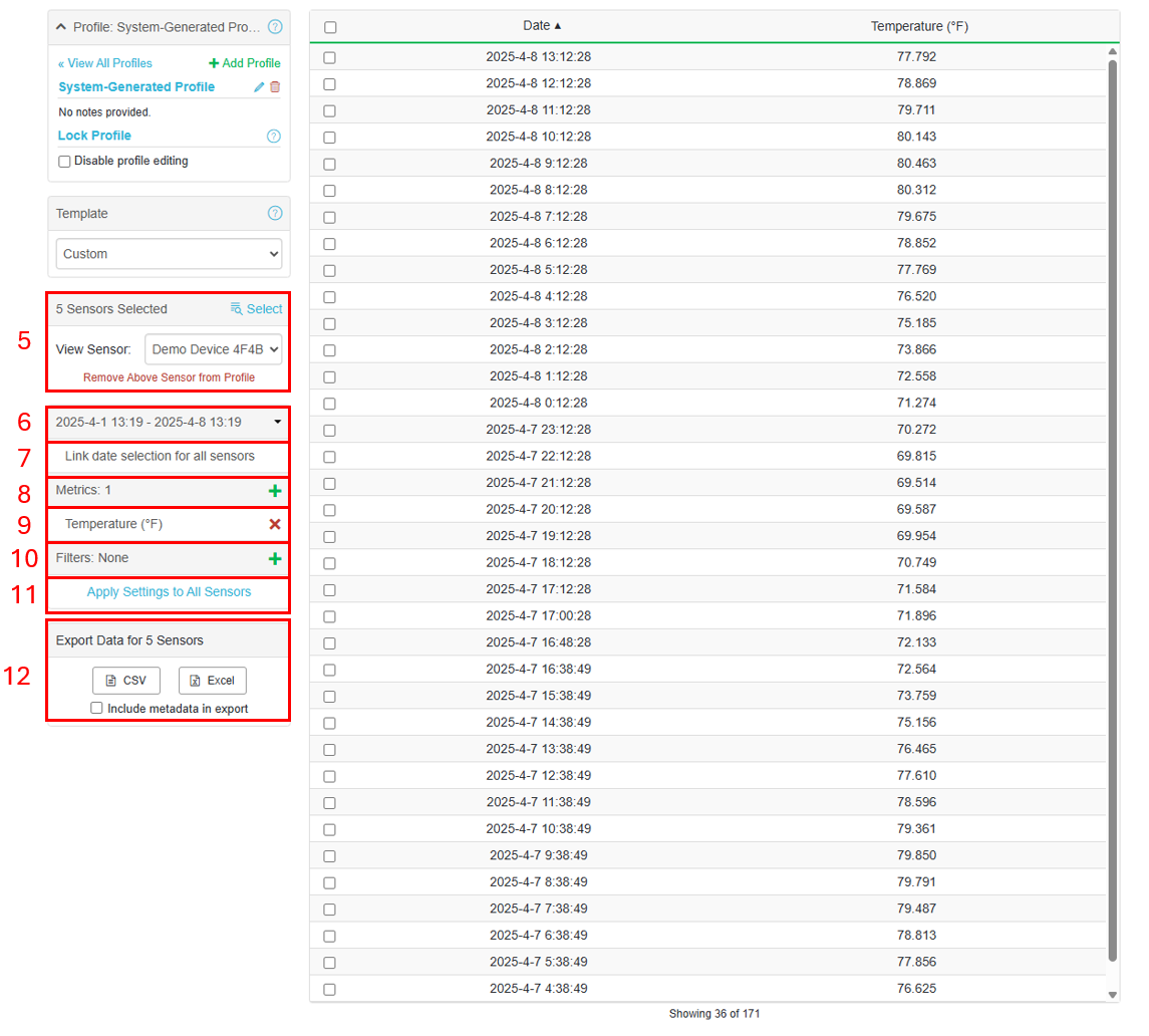 Note 2: When the user uses either export button, data for ALL the sensors that were selected in Step 4 will be downloaded, not just the data for the sensor currently displayed.