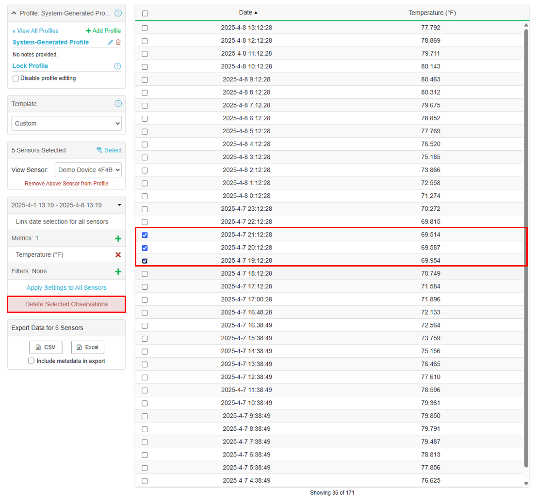 To do this check the boxes next to the data points that need to be deleted. Once at least one data entry is selected the