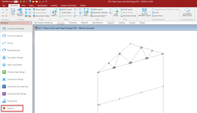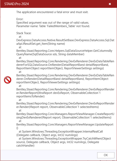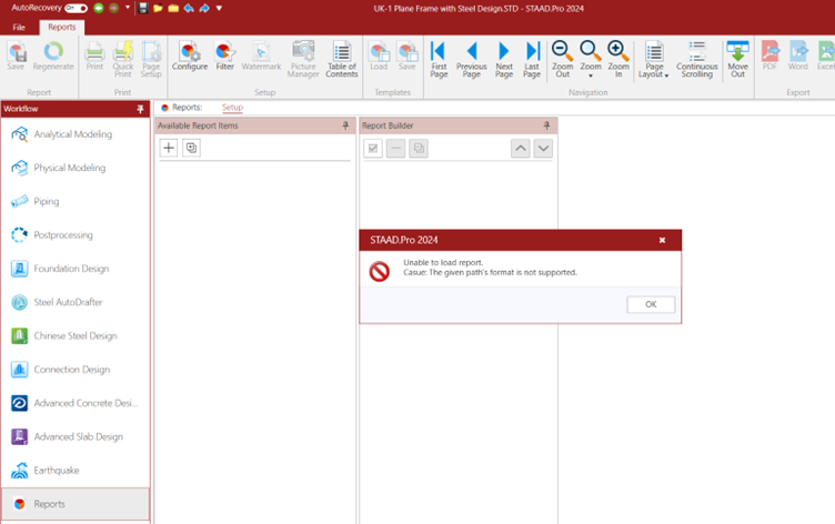 A limitation has been identified in STAAD.Pro 2023 and 2024 in the utility to create a user defined report in the ‘Reports’ workflow. This issue is encountered when the model data is located on a network folder which is either accessed directly (i.e. Network Drive) or by creating a Mapped Drive.