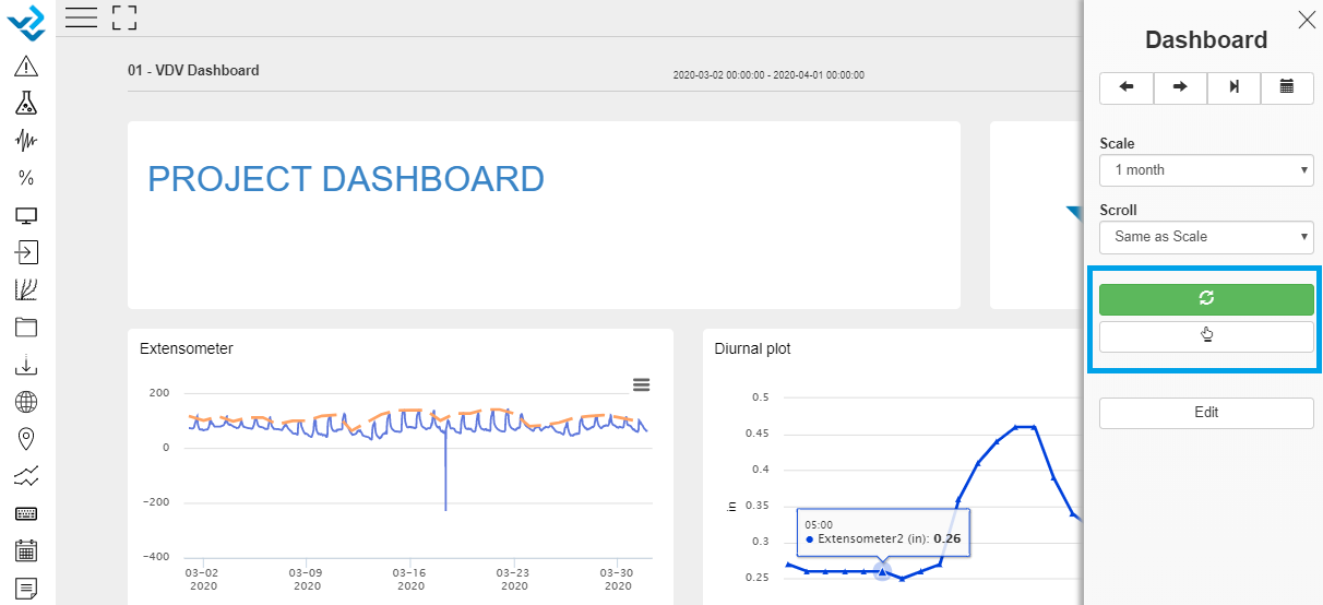 By clicking on the ... icon in the top right corner, you can modify the time scale of the Dashboard and also scroll in the data. If users have access to Dashboard Settings, they will also see an Edit button to modify that specific Dashboard.
