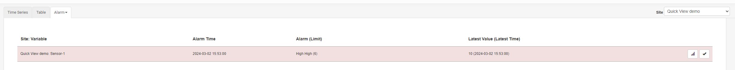 Quick View is a useful feature to quickly check values for variables in a site. In Quick View you can see table values, graphs, active alarms and alarm logs.